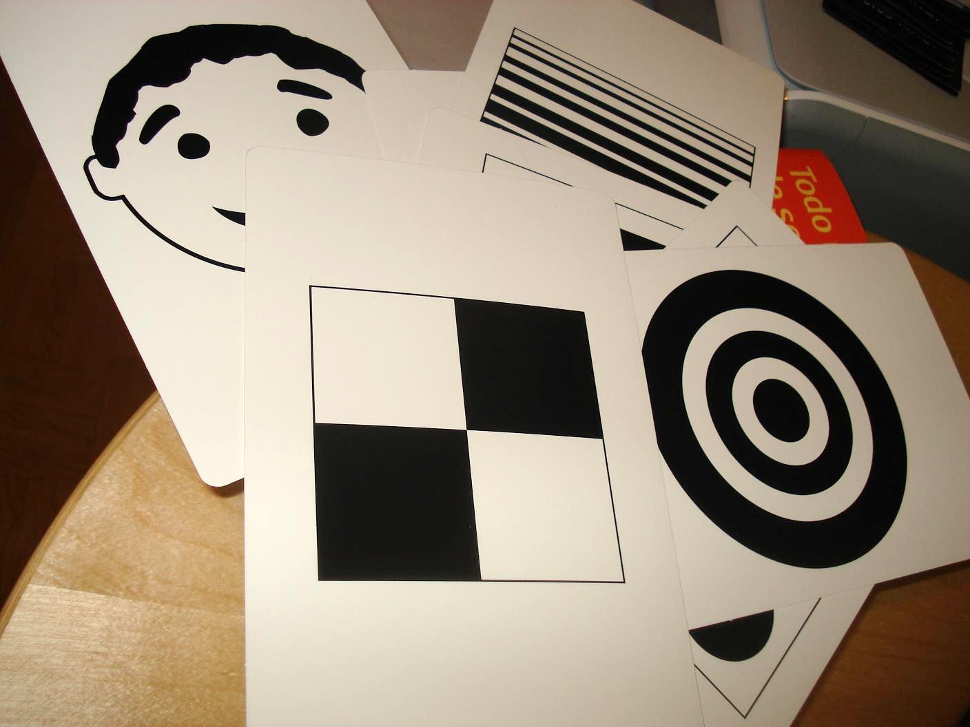 En cuanto a las tarjetas en blanco y negro para estimular a los bebés si son interesantes y los bebés suelen prestar mucha atención a ellas. No es fácil mantener la atención de niños tanpequeños y con los contrastes de tono claro y oscuro se consigue. Es increíble. Yo al mío le mostré también algunas que sacamos de internet. No es que haya que obsesionarse con planes de trabajo para bebitos, pero sí es interesante ver cómo reaccionan y estimularles un poquito.