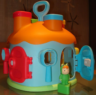 Me enamoré de esta casita un día haciendo la compra en el Hipercor hace ya varios meses. Pensamos en comprársela para su primer cumpleaños, pero me pareció demasiado pequeño y decidimos dejarlo para Navidad. Le ha hecho gracia pero aún es pronto para que le saque partido. No sé si se aprecia, pero las puertas se abren con las llaves que lleva encajadas en las ventanas; obviamente, esta utilidad hoy por hoy no sabe emplearla. Los muñequitos llevan formas en su base y se meten por la parte superior, que tienen varias pseudo-chimeneas. De momento, más que encajar, lo que más le gusta es meter cosas dentro y mirar a través de las puertas y ventanas.