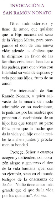 Para las que esteis también en capilla, que alguna habrá, y aun a riesgo de que penseis que se me ha ido la cabeza definitivamente, os pongo una oración a San Ramón Nonato que me dió mi ginecológo. ¡Sí, habéis leído bien: mi ginecólogo y yo hablamos sobre Dios en la consulta!. Días antes de la cesárea, viendo como me encontraba, me dió esto: